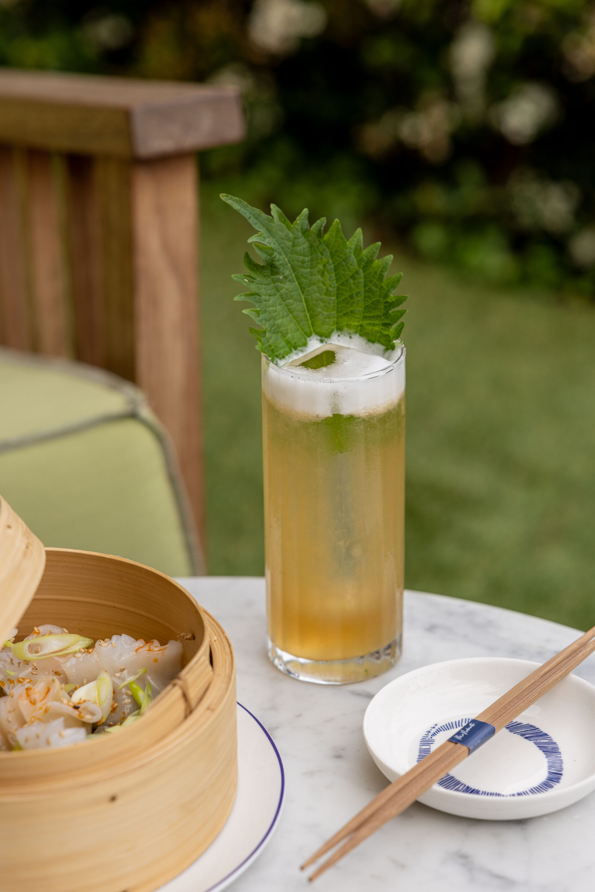 Etsu Pacific Ocean Water, Sea Salt Yuzushu Liqueur, bitter shiso, shrub shiso, Tonic London Essence, feuille de shiso, jus de citrone et yuzu.