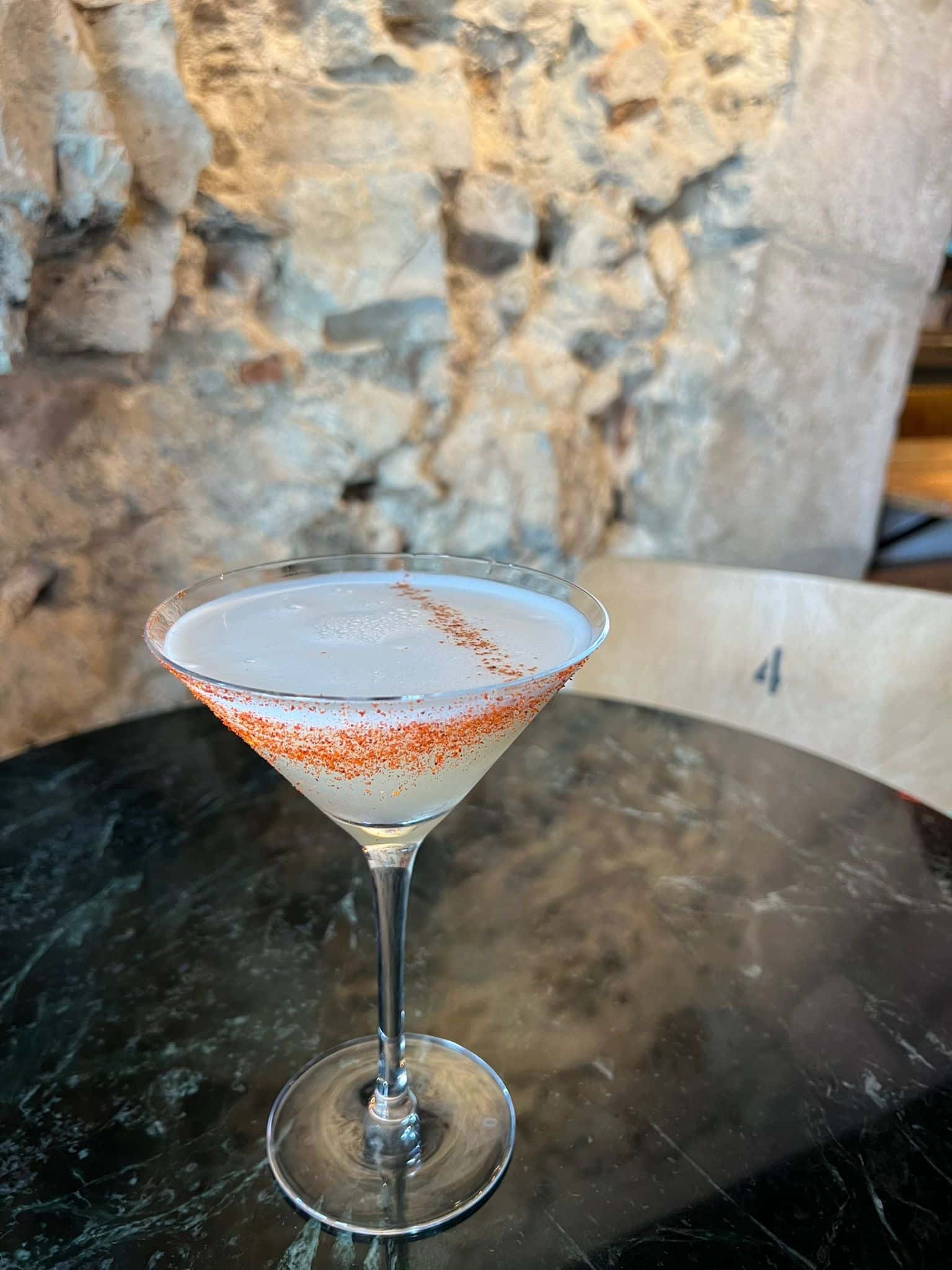 Etsu Pacific Ocean Water, liqueur de poire Brana, sirop de vanille, un trait de bitters cacao, piment d’Espelette.